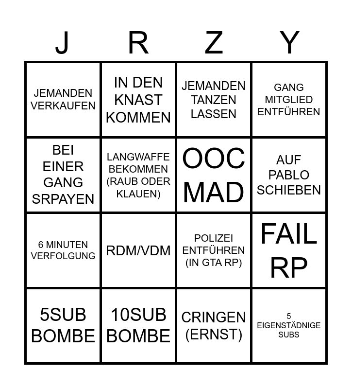 This bingo card has 16 words: 10SUB BOMBE, FAIL RP, JEMANDEN TANZEN LASSEN, JEMANDEN VERKAUFEN, 6 MINUTEN VERFOLGUNG, IN DEN KNAST KOMMEN, POLIZEI ENTFÜHREN (IN GTA RP), CRINGEN (ERNST), BEI EINER GANG SRPAYEN, LANGWAFFE BEKOMMEN (RAUB ODER KLAUEN), 5SUB BOMBE, GANG MITGLIED ENTFÜHREN, RDM/VDM, AUF PABLO SCHIEBEN, OOC MAD and 5 EIGENSTÄDNIGE SUBS.