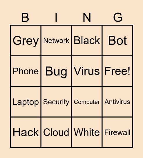 This bingo card has 17 words: White, Hack, Black, Grey, Security, Bot, Antivirus, Virus, Free!, Bug, Cloud, Computer, Phone, Network, Laptop, Code and Firewall.