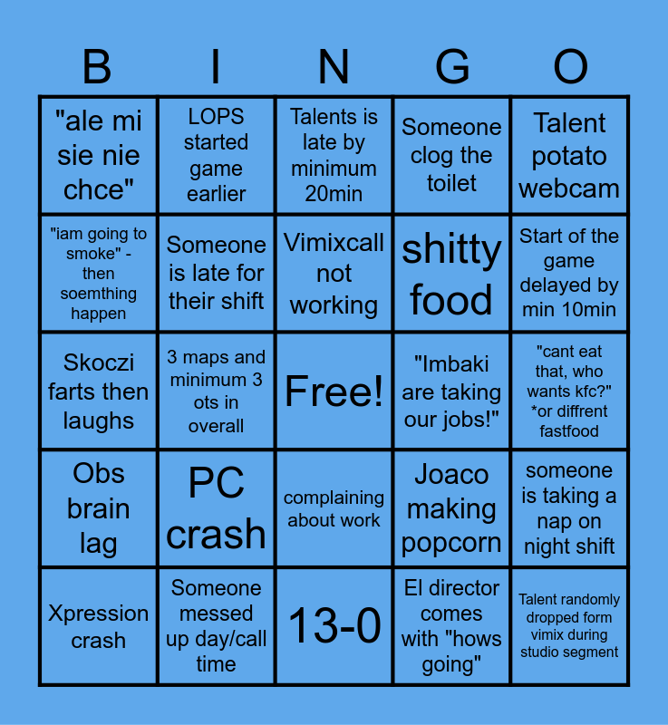 This bingo card has a free space and 24 words: PC crash, Someone messed up day/call time, Vimixcall not working, Xpression crash, Talent potato webcam, "ale mi sie nie chce", "iam going to smoke" - then soemthing happen, LOPS started game earlier, "Imbaki are taking our jobs!", complaining about work, shitty food, Skoczi farts then laughs, Joaco making popcorn, someone is taking a nap on night shift, Someone is late for their shift, El director comes with "hows going", "cant eat that, who wants kfc?" *or diffrent fastfood, Talents is late by minimum 20min, Start of the game delayed by min 10min, 3 maps and minimum 3 ots in overall, Talent randomly dropped form vimix during studio segment, Obs brain lag, Someone clog the toilet and 13-0.