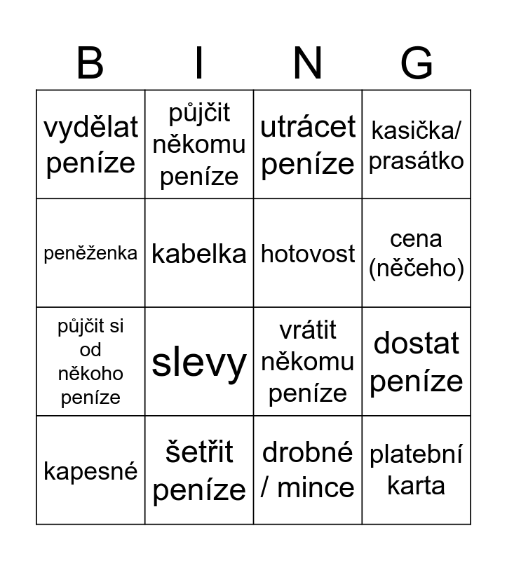 This bingo card has 16 words: šetřit peníze, dostat peníze, utrácet peníze, vydělat peníze, půjčit si od někoho peníze, půjčit někomu peníze, vrátit někomu peníze, drobné / mince, peněženka, kabelka, kapesné, kasička/ prasátko, slevy, cena (něčeho), hotovost and platební karta.