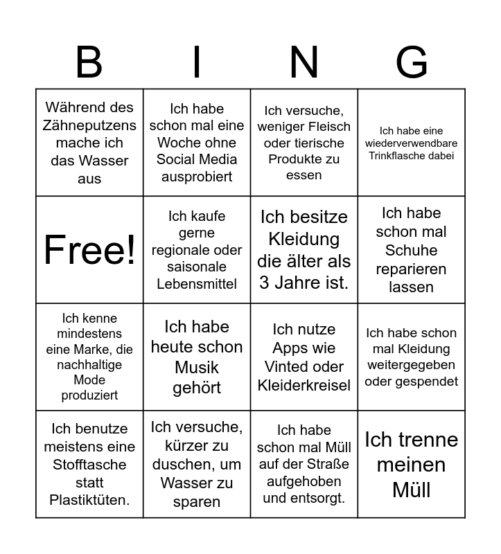 This bingo card has 37 words: Ich habe schon mal Kleidung secondhand gekauft, Ich habe schon von einer Kleidertauschparty gehört, Ich habe schon mal etwas selbst genäht oder umgestaltet, Ich besitze Kleidung die älter als 3 Jahre ist., Ich habe schon mal etwas in einem Fair-Fashion Laden gekauft, Ich trage gerne Vintage-Kleidung, Ich habe schon mal Schuhe reparieren lassen, Ich habe ein Kleidungsstück, dass aus recycelten Materialien besteht., Free!, Ich finde Fast Fashion problematisch, Ich habe schon mal Kleidung weitergegeben oder gespendet, Ich habe eine wiederverwendbare Trinkflasche dabei, Ich benutze meistens eine Stofftasche statt Plastiktüten., Ich habe schon mal Müll auf der Straße aufgehoben und entsorgt., Ich kaufe gerne regionale oder saisonale Lebensmittel, Ich trenne meinen Müll, Ich habe schon mal bei einer Umweltaktion oder Demo mitgemacht, Ich versuche, weniger Fleisch oder tierische Produkte zu essen, Ich habe schon mal ein nachhaltiges Produkt einer bekannten Marke ausprobiert, Ich versuche, kürzer zu duschen, um Wasser zu sparen, Während des Zähneputzens mache ich das Wasser aus, Ich habe heute schon Musik gehört, Ich war diese Woche mindestens einmal draußen in der Natur, Ich habe schon mal freiwillig ein Buch gelesen, Ich habe ein Lieblingsessen, das ich selbst kochen kann, Ich verbringe täglich mehr als 2 Stunden am Handy, Ich habe schon mal eine Woche ohne Social Media ausprobiert, Ich habe schon mal selbst etwas repariert (z.B. Fahrrad, Handy-Kabel), Ich habe eine Serien oder einen Film gesehen, der sich mit Nachhaltigkeit beschäftigt, Ich kennen jemanden, der sich für Fair Fashion oder nachhaltige Mode interessiert, Ich habe schon mal eine Petition unterschrieben oder an einer Umfrage zu Umwelt-Themen teilgenommen, Ich habe ein Kleidungsstück, das eine besondere Bedeutung für mich hat, Ich nutze Apps wie Vinted oder Kleiderkreisel, Ich finde, dass Nachhaltigkeit ein wichtiges Thema ist, Ich habe schon mal Klmaotten von Freund*innen oder Geschwistern bekommen, Ich kenne mindestens eine Marke, die nachhaltige Mode produziert and Ich habe schon mal ein DIY-Projekt gemacht (z.B. Kleidung gefärbt, Schmuck gebastet, Upcycling).