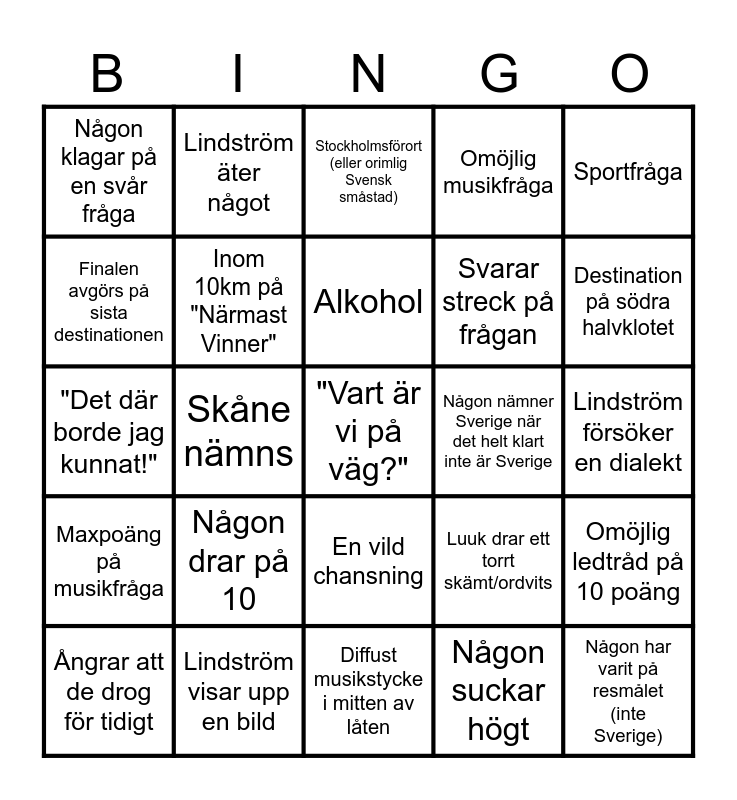 This bingo card has a free space and 24 words: Någon drar på 10, Lindström visar upp en bild, Alkohol, Ångrar att de drog för tidigt, Sportfråga, Någon klagar på en svår fråga, Finalen avgörs på sista destinationen, Lindström äter något, Någon nämner Sverige när det helt klart inte är Sverige, En vild chansning, Svarar streck på frågan, "Det där borde jag kunnat!", Luuk drar ett torrt skämt/ordvits, Omöjlig ledtråd på 10 poäng, Inom 10km på "Närmast Vinner", Någon suckar högt, Lindström försöker en dialekt, Stockholmsförort (eller orimlig Svensk småstad), Destination på södra halvklotet, Skåne nämns, Någon har varit på resmålet (inte Sverige), Maxpoäng på musikfråga, Omöjlig musikfråga and Diffust musikstycke i mitten av låten.