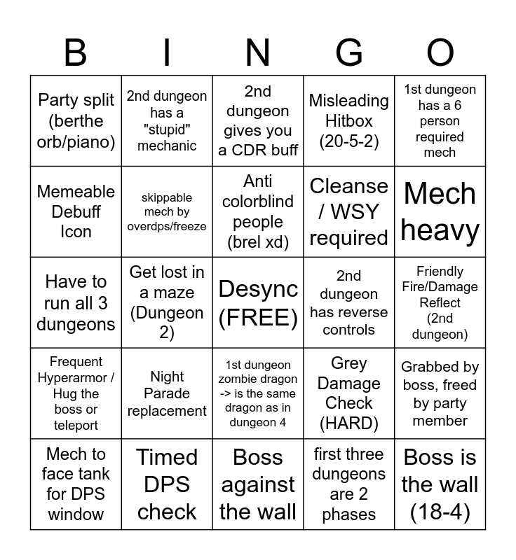 This bingo card has a free space and 34 words: Kei gives her account to Shimo if 3 dungeon boss isnt a midget, first three dungeons are 2 phases, Have a use Hyperactive/Master Skill for a mech, Pattern/DPS heavy, Frequent Hyperarmor / Hug the boss or teleport, skippable mech by overdps/freeze, 1st dungeon has a 6 person required mech, Mech to face tank for DPS window, 2nd dungeon has a "stupid" mechanic, 3rd dungeon has mind control effect, Anti colorblind people (brel xd), 2nd dungeon gives you a CDR buff, HP Thresholds / Cant skip mechs, Coordinated mech (d4 piano type / yin yang), 2nd dungeon has reverse controls, Mech heavy, Timed DPS check, Have to run all 3 dungeons, Night Parade replacement, Grey Damage Check (HARD), 1st dungeon zombie dragon -> is the same dragon as in dungeon 4, 92%+ Defense, Party split (berthe orb/piano), Friendly Fire/Damage Reflect (2nd dungeon), Boss against the wall, Boss is the wall (18-4), Misleading Hitbox (20-5-2), Undodgable Lethal Pattern, Cleanse / WSY required, Memeable Debuff Icon, Speed Lower Debuff, Get lost in a maze (Dungeon 2), Grabbed by boss, freed by party member and F1.