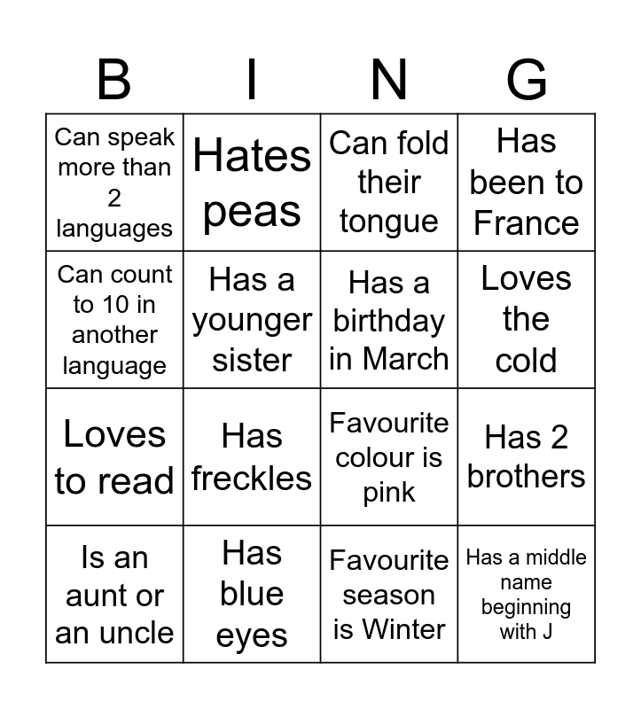 This bingo card has 16 words: Has blue eyes, Has 2 brothers, Can fold their tongue, Can speak more than 2 languages, Loves to read, Hates peas, Favourite colour is pink, Favourite season is Winter, Can count to 10 in another language, Has a younger sister, Is an aunt or an uncle, Has been to France, Has freckles, Loves the cold, Has a birthday in March and Has a middle name beginning with J.