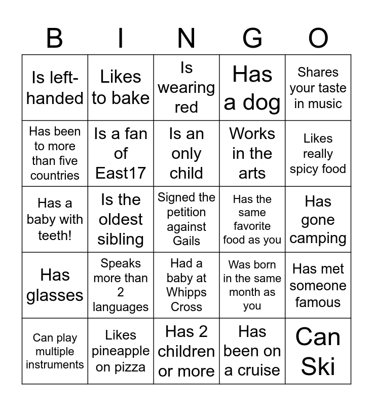 This bingo card has a free space and 24 words: Speaks more than 2 languages, Likes pineapple on pizza, Is an only child, Can play multiple instruments, Shares your taste in music, Is left-handed, Has been to more than five countries, Likes to bake, Has the same favorite food as you, Had a baby at Whipps Cross, Works in the arts, Has a baby with teeth!, Was born in the same month as you, Has met someone famous, Is a fan of East17, Has been on a cruise, Has gone camping, Is wearing red, Likes really spicy food, Is the oldest sibling, Can Ski, Has glasses, Has a dog and Has 2 children or more.