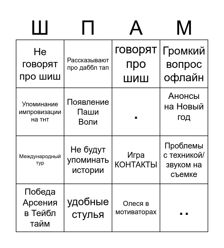This bingo card has 16 words: удобные стулья, Проблемы с техникой/звуком на съемке, говорят про шиш, Не говорят про шиш, Международный тур, Рассказывают про даббл тап, Игра КОНТАКТЫ, Олеся в мотиваторах, Упоминание импровизации на тнт, Появление Паши Воли, Победа Арсения в Тейбл тайм, Громкий вопрос офлайн, Не будут упоминать истории, Анонсы на Новый год, . and ...