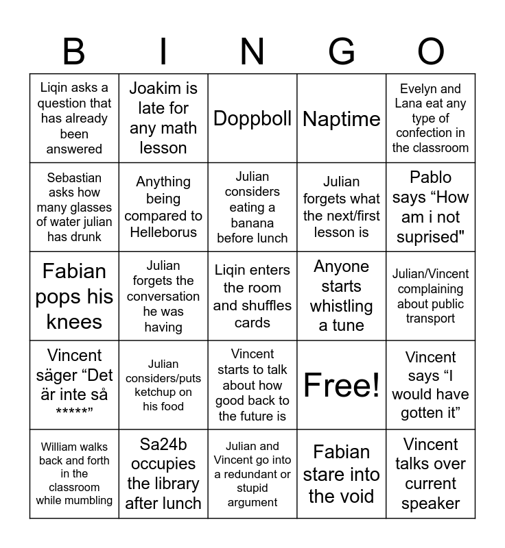 This bingo card has 25 words: Julian considers/puts ketchup on his food, Julian and Vincent go into a redundant or stupid argument, Julian considers eating a banana before lunch, William walks back and forth in the classroom while mumbling, Evelyn and Lana eat any type of confection in the classroom, Liqin asks a question that has already been answered, Sebastian asks how many glasses of water julian has drunk, Joakim is late for any math lesson, Anyone starts whistling a tune, Vincent starts to talk about how good back to the future is, Julian forgets what the next/first lesson is, Fabian pops his knees, Free!, Vincent says “I would have gotten it”, Anything being compared to Helleborus, Vincent talks over current speaker, Julian/Vincent complaining about public transport, Doppboll, Pablo says “How am i not suprised", Julian forgets the conversation he was having, Liqin enters the room and shuffles cards, Sa24b occupies the library after lunch, Vincent säger “Det är inte så *****”, Naptime and Fabian stare into the void.