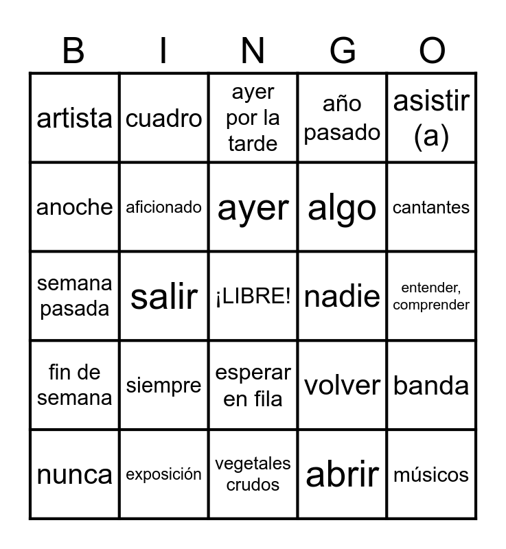 This bingo card has a free space and 59 words: arte, exposición, a pie, fin de semana, abrir, friqui, friki, aficionado, galletas, algo, grupo musical, año pasado, ir, anoche, antes de, museo, artista, músicos, asistir (a), nada, ayer, nadie, ayer por la tarde, nunca, banda, oír, pastel, torta, bizcocho, cacahuates, película, cantantes, picar, concierto, pintor, palomitas, recibir, cuadro, regalo, cumpleaños, salir, dar, semana pasada, después de, siempre, entender, comprender, taquilla, entradas, teatro, escuchar, escultor, esperar en fila, vegetales crudos, esta noche, velas, esta tarde, ver, estatua, volver, tomar, mirar and cine.