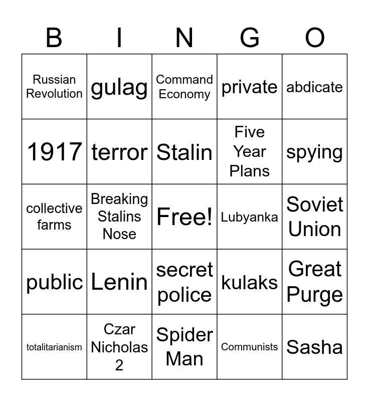This bingo card has a free space and 24 words: Lenin, Czar Nicholas 2, Stalin, totalitarianism, abdicate, Russian Revolution, 1917, gulag, Lubyanka, secret police, Five Year Plans, collective farms, kulaks, Great Purge, terror, Communists, Soviet Union, Command Economy, spying, Breaking Stalins Nose, Sasha, public, private and Spider Man.