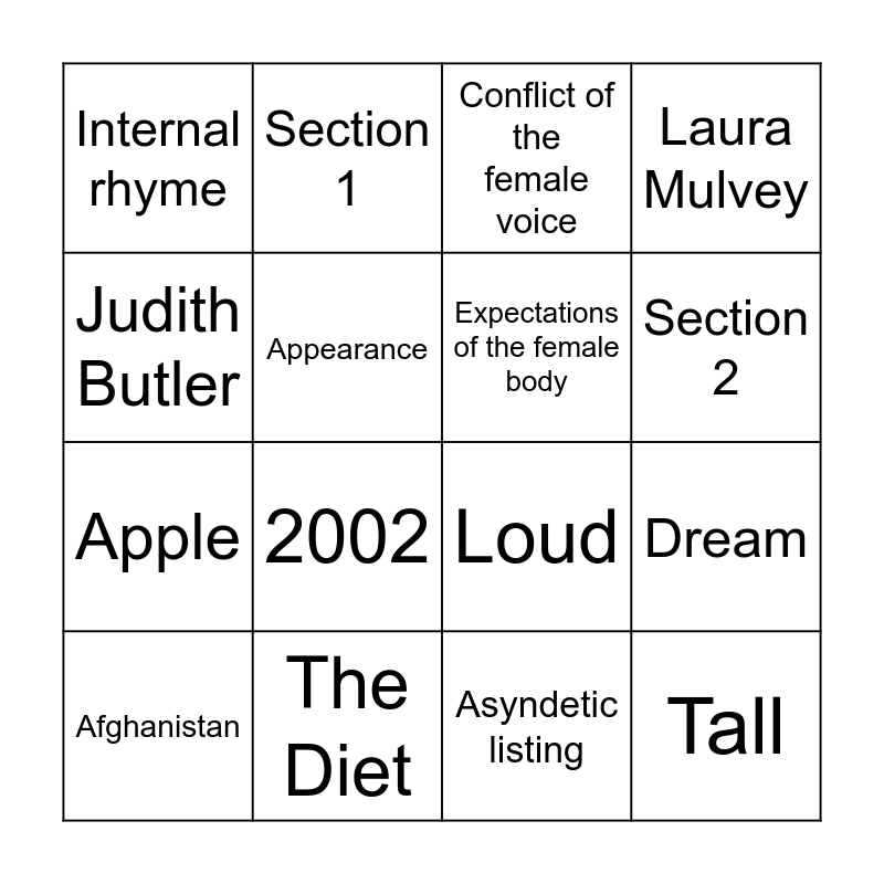 This bingo card has 16 words: Afghanistan, The Diet, Conflict of the female voice, Laura Mulvey, Judith Butler, Section 1, Loud, Dream, Internal rhyme, Appearance, Asyndetic listing, Section 2, Apple, 2002, Expectations of the female body and Tall.