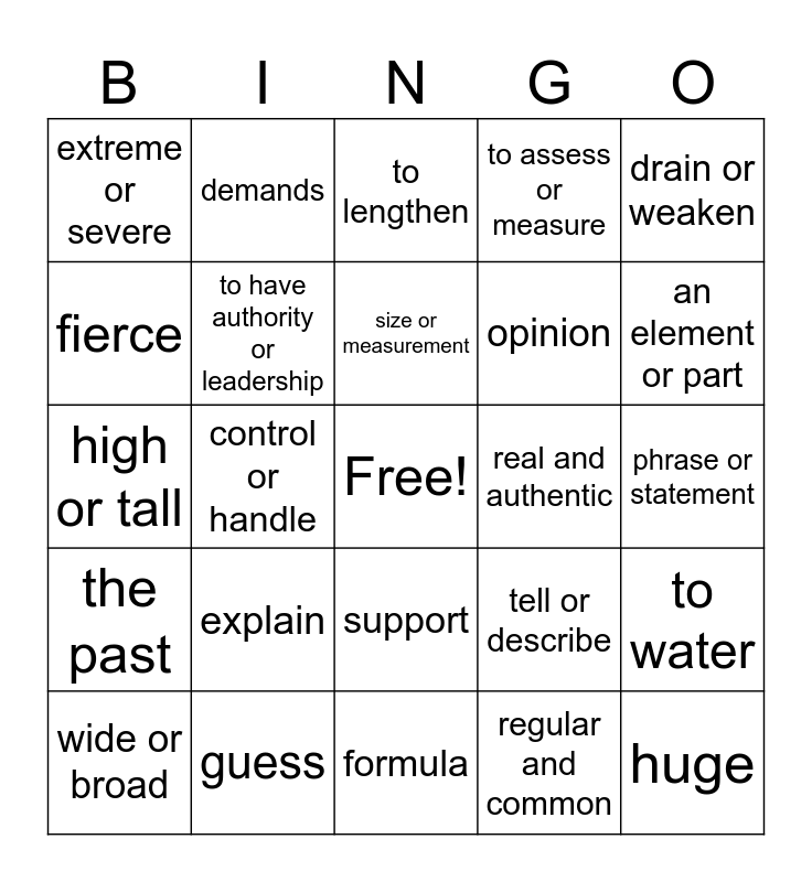 This bingo card has a free space and 24 words: explain, guess, size or measurement, wide or broad, drain or weaken, extreme or severe, fierce, demands, real and authentic, support, opinion, high or tall, tell or describe, to water, to have authority or leadership, regular and common, phrase or statement, to lengthen, an element or part, control or handle, huge, the past, to assess or measure and formula.