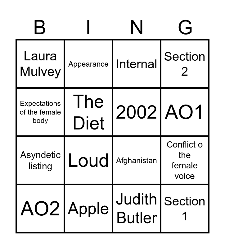 This bingo card has 19 words: Afghanistan, Dream, Internal, Section 1, Conflict o the female voice, Expectations of the female body, Judith Butler, Laura Mulvey, Appearance, Asyndetic listing, Loud, The Diet, 2002, Apple, AO2, American Dream, Section 2, AO1 and Moon.