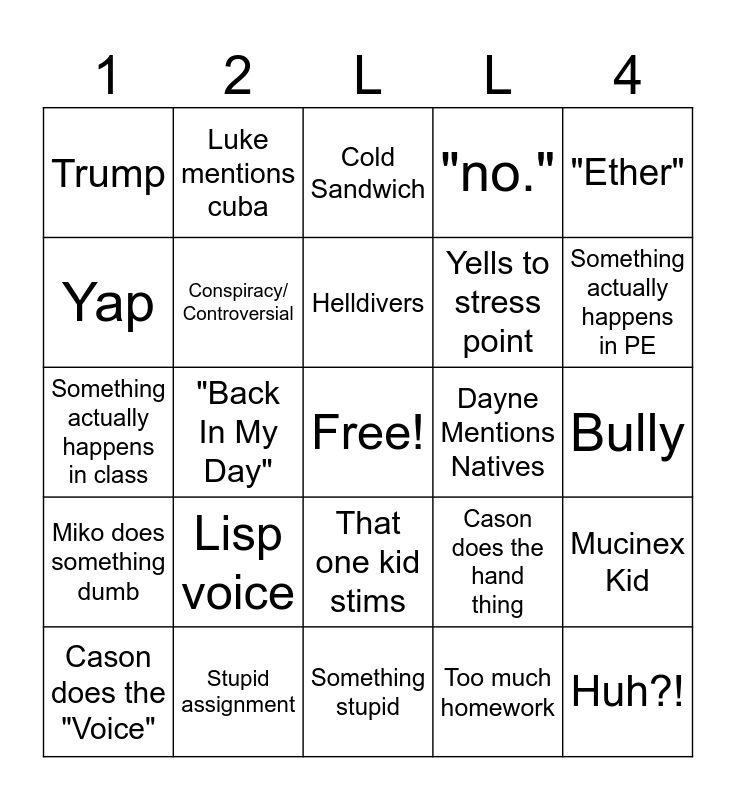 This bingo card has a free space and 24 words: Lisp voice, Stupid assignment, Helldivers, Cason does the "Voice", "Ether", Trump, Yap, Luke mentions cuba, Dayne Mentions Natives, That one kid stims, Yells to stress point, Something actually happens in class, Cason does the hand thing, Mucinex Kid, Conspiracy/ Controversial, Too much homework, Bully, Cold Sandwich, Something actually happens in PE, "Back In My Day", Huh?!, Miko does something dumb, "no." and Something stupid.