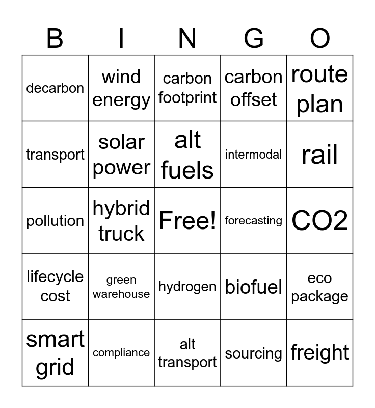 This bingo card has a free space and 75 words: sustainability, eco-friendly, carbon footprint, emissions, renewable, efficiency, supply chain, waste, fuel efficiency, biodegradable, packaging, green supply, alt fuels, transport, EV, hybrid truck, last-mile, freight, reverse logistics, route plan, climate impact, pollution, solar power, wind energy, carbon offset, recycling, smart logistics, autonomous, digitalization, automation, blockchain, warehouse, cold chain, biofuel, rail, intermodal, modal shift, lifecycle, CO2, sourcing, CSR, ESG, carbon neutral, green cert, urban logistics, low-emission, smart grid, decarbon, electrification, carbon tax, energy save, hydrogen, logistics 4.0, digital twin, AI optimize, big data, IoT, predictive, fleet manage, emissions trade, green warehouse, e-forklift, green procure, multimodal, lean logistics, forecasting, waste manage, shared mobility, JIT, eco package, lifecycle cost, compliance, standards, alt transport and climate logistics.