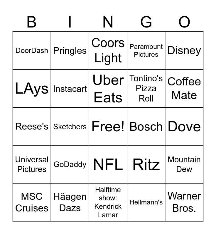 This bingo card has a free space and 24 words: GoDaddy, Häagen Dazs, Uber Eats, MSC Cruises, Disney, DoorDash, LAys, Pringles, Bosch, NFL, Tontino's Pizza Roll, Reese's, Ritz, Mountain Dew, Instacart, Hellmann's, Dove, Coors Light, Coffee Mate, Sketchers, Warner Bros., Universal Pictures, Paramount Pictures and Halftime show: Kendrick Lamar.
