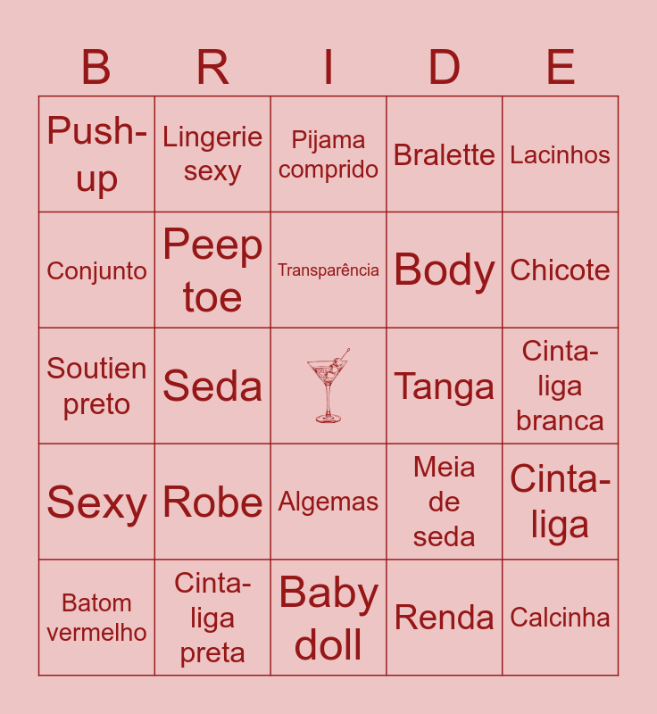 This bingo card has a free space and 48 words: Soutien, Calcinha, Meia-calça, Baby doll, Robe, Corset, Lingerie sexy, Fio dental, Conjunto, Sunga, Peep toe, Bralette, Cinta-liga, Meia de seda, Laço, Alça, Transparência, Tanga, Strappy bra, Lacinhos, Seda, Renda, Push-up, Body, Lingerie colorida, Chicote, Batom vermelho, Perfume, Algemas, Sexy, Sensualidade, Roupão, Camisetão de dormir, Cinta-liga vermelha, Cinta-liga preta, Espartilho vermelho, Espartilho preto, Cinta-liga branca, Meia-calça bege, Meia-calça preta, Luvas, Camisola, Pijama comprido, Calcinha de algodão, Soutien preto, Soutien vermelho, Soutien branco and Calcinha de renda.
