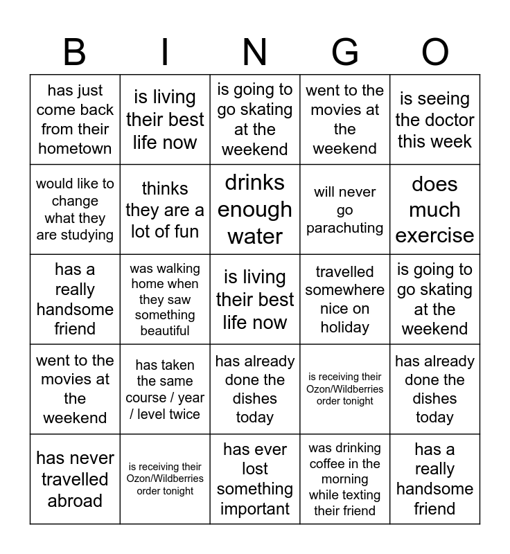 This bingo card has 43 words: Free!, is living their best life now, is dating someone, has never travelled abroad, has just come back from their hometown, was drinking coffee in the morning while texting their friend, is going to go skating at the weekend, is going to retake an exam soon, is seeing the doctor this week, is receiving their Ozon/Wildberries order tonight, went to the movies at the weekend, travelled somewhere nice on holiday, has already done the dishes today, has taken the same course / year / level twice, was walking home when they saw something beautiful, has ever lost something important, plays a musical instrument, has a really handsome friend, drinks enough water, does much exercise, is living their best life now, is dating someone, has never travelled abroad, has just come back from their hometown, was drinking coffee in the morning while texting their friend, is going to go skating at the weekend, is going to retake an exam soon, is seeing the doctor this week, is receiving their Ozon/Wildberries order tonight, went to the movies at the weekend, travelled somewhere nice on holiday, has already done the dishes today, has taken the same course / year / level twice, was walking home when they saw something beautiful, has ever lost something important, plays a musical instrument, has a really handsome friend, drinks enough water, would like to change what they are studying, will never go parachuting, would like to start their own business, thinks they are a lot of fun and totally hates what they are studying.