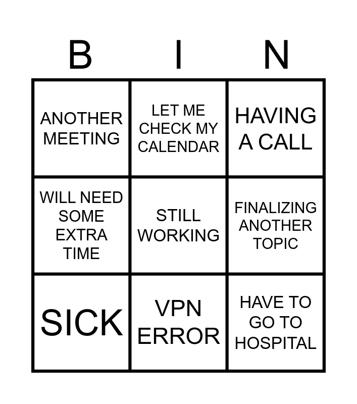 This bingo card has 9 words: SICK, STILL WORKING, HAVING A CALL, ANOTHER MEETING, LET ME CHECK MY CALENDAR, FINALIZING ANOTHER TOPIC, WILL NEED SOME EXTRA TIME, VPN ERROR and HAVE TO GO TO HOSPITAL.