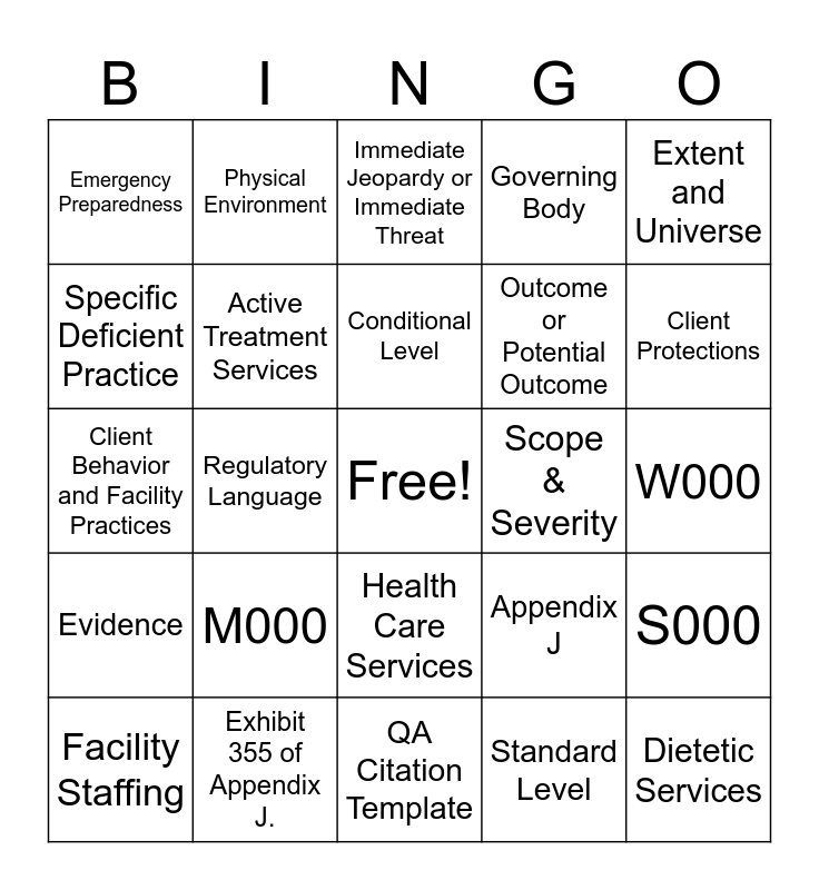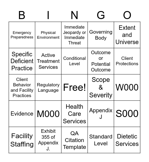 This bingo card has a free space and 24 words: M000, Exhibit 355 of Appendix J., Conditional Level, Facility Staffing, Extent and Universe, Emergency Preparedness, Specific Deficient Practice, Physical Environment, Scope & Severity, Health Care Services, Outcome or Potential Outcome, Client Behavior and Facility Practices, Appendix J, S000, Active Treatment Services, Standard Level, W000, Immediate Jeopardy or Immediate Threat, Client Protections, Regulatory Language, Dietetic Services, Evidence, Governing Body and QA Citation Template.
