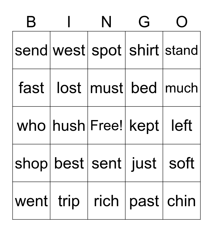 This bingo card has a free space and 24 words: best, trip, must, went, stand, send, fast, west, kept, sent, bed, who, just, soft, lost, past, left, spot, much, hush, chin, shop, shirt and rich.