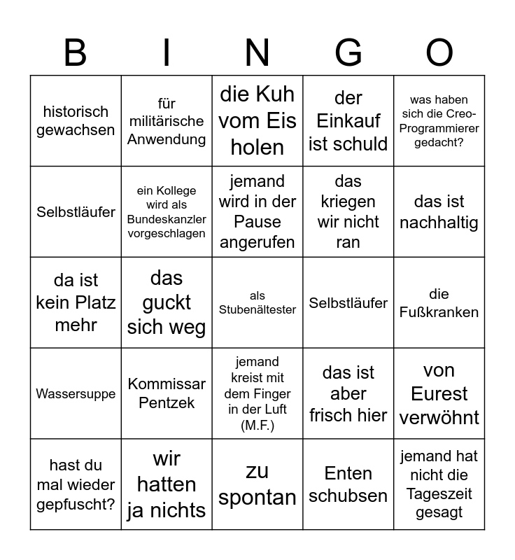 This bingo card has 77 words: Eumel, die Fußkranken, die Kuh vom Eis holen, Kommissar Pentzek, zum Lippen befeuchten, hast du mal wieder gepfuscht?, mach's doch gleich richtig, Olek & Bolek, das wird injearbeitet, von Eurest verwöhnen, jemand hat nicht die Tageszeit gesagt, Ich bin dagegen, jemand wird in der Pause angerufen, Selbstläufer, da war wieder jemand wichtig, das guckt sich weg, Axelhöhle, als Stubenältester, im falschen Papierformat gedruckt, was haben sich die Creo-Programmierer gedacht?, weil es (oliv-)grün ist, da ist kein Platz mehr, ein Kollege wird als Bundeskanzler vorgeschlagen, für militärische Anwendung, der Einkauf ist schuld, jemand wird vom Chef versetzt, jemand macht das Fenster auf und geht, das kriegen wir nicht ran, armes Häschen, Brocken, Bürschchen, da war jemand wichtig, das guckt sich weg, das ist aber frisch hier, das ist nachhaltig, das kriegen wir nicht ran, das wird injearbeitet, das wird super, die Fußkranken, Enten schubsen, Erweiterter Arbeitsbereich, es könnte so schön sein, es muss nicht schmecken, es muss wirken, Eumel, geistiger Dünnschiss, Gurkentruppe, hast du mal wieder gepfuscht?, historisch gewachsen, ich bin dagegen, ist das dröge hier, jemand hat nicht die Tageszeit gesagt, jemand kreist mit dem Finger in der Luft (M.F.), jemand macht das Fenster auf und geht, jemand wird in der Pause angerufen, jemand wird vom Chef versetzt, jetzt ne Torte/Kuchen/Teilchen, Kafe, Kärcher, Käsebrot, Knödelmodell, Kommissar Pentzek, Kümmerer, mach’s doch gleich richtig, Macher, Mimimi, Moped, Schulterklopfer, Selbstläufer, Stubenältester, Superkonzentrations- modus, Teufelszeug, von Eurest verwöhnt, Wassersuppe, wir hatten ja nichts, zu Adolfs Zeiten, zu spontan and zum Lippen befeuchten.