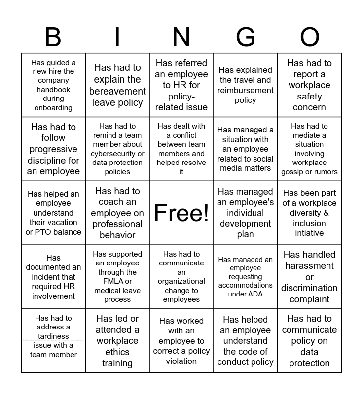 This bingo card has 1 images, a free space and 24 words: Has had to address a tardiness issue with a team member, Has supported an employee through the FMLA or medical leave process, Has dealt with a conflict between team members and helped resolve it, Has helped an employee understand the code of conduct policy, Has had to report a workplace safety concern, Has guided a new hire the company handbook during onboarding, Has had to explain the bereavement leave policy, Has referred an employee to HR for policy-related issue, Has managed an employee's individual development plan, Has been part of a workplace diversity & inclusion intiative, Has helped an employee understand their vacation or PTO balance, Has had to remind a team member about cybersecurity or data protection policies, Has managed an employee requesting accommodations under ADA, Has handled harassment or discrimination complaint, Has had to follow progressive discipline for an employee, Has led or attended a workplace ethics training, Has worked with an employee to correct a policy violation, Has explained the travel and reimbursement policy, Has had to mediate a situation involving workplace gossip or rumors, Has documented an incident that required HR involvement, Has had to coach an employee on professional behavior, Has had to communicate an organizational change to employees, Has managed a situation with an employee related to social media matters and Has had to communicate policy on data protection.