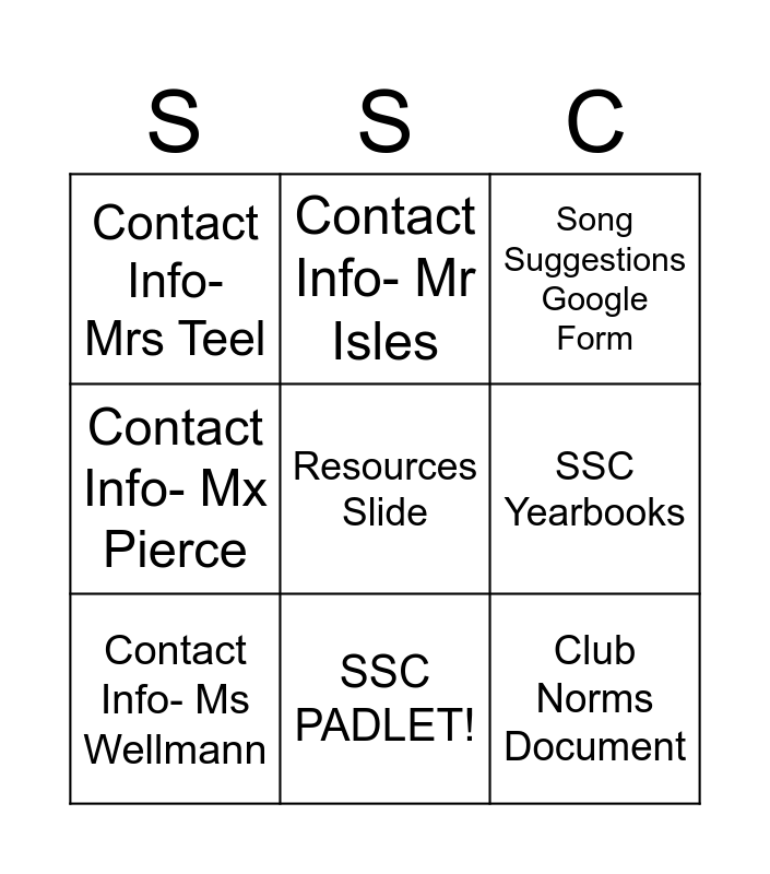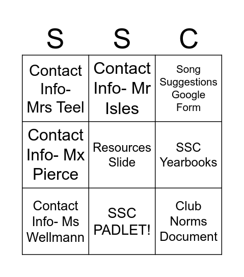 This bingo card has 12 words: Free!, Club Norms Document, Resources Slide, SSC Yearbooks, Contact Info- Mr Isles, Song Suggestions Google Form, SSC PADLET!, Contact Info- Mr Sanko, Contact Info- Mrs Teel, Contact Info- Mx Pierce, Contact Info- Ms Wellmann and Contact Info- Ms Kreuger (Mrs Curran on MB).