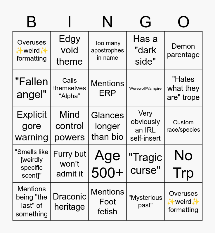 This bingo card has 26 words: Age 500+, "Mysterious past", Mentions ERP, Draconic heritage, Demon parentage, Overuses ✨weird✨ formatting, "Fallen angel", Edgy void theme, Custom race/species, "Tragic curse", Werewolf/Vampire, Explicit gore warning, No Trp, Mentions being "the last" of something, Mind control powers, "Godkiller" title, Has a "dark side", "Smells like [weirdly specific scent]", Too many apostrophes in name, Glances longer than bio, "Hates what they are" trope, Mentions Foot fetish, Very obviously an IRL self-insert, Furry but won’t admit it, Calls themselves “Alpha” and Overuses ✨weird✨ formatting.