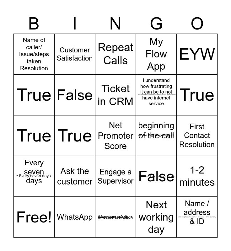 This bingo card has 6 images and 27 words: False, Name / address & ID, I understand how frustrating it can be to not have internet service, #AccelertaeAction, True, Repeat Calls, Customer Satisfaction, Every seven days, beginning of the call, 1-2 minutes, True, My Flow App, Free!, WhatsApp, True, PRC, False, Ticket in CRM, Ask the customer, Name of caller/ Issue/steps taken Resolution, First Contact Resolution, Next working day, True, Net Promoter Score, Engage a Supervisor, EYW and True.