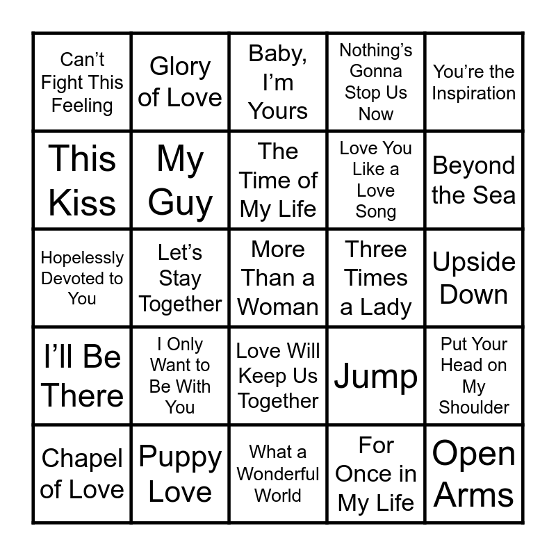 This bingo card has 136 words: Free!, Crazy, At Last, You Send Me, Then He Kissed Me, All My Loving, Chapel of Love, Heat Wave, I Can’t Help Myself, Be My Baby, My Girl, Baby Love, I Got You Babe, I Want to Hold Your Hand, Unchained Melody, When a Man Loves a Woman, Can’t Take My Eyes Off You, My Cherie Amour, Sugar, Sugar, Put a Little Love in Your Heart, What a Wonderful World, One Fine Day, Baby, I’m Yours, Signed, Sealed, Delivered, This Magic Moment, I Only Want to Be With You, Three Times a Lady, Just the Way You Are, How Deep is Your Love, Wonderful Tonight, I’ll Be There, Hopelessly Devoted to You, For Once in My Life, Let’s Stay Together, Close to You, Your Song, More Than a Feeling, You’re the First, the Last, My Everything, Somebody to Love, This Will Be, More Than a Woman, I’ll Have to Say I Love You in a Song, Where is the Love, December, 1963, Love is in the Air, Puppy Love, Don’t Go Breaking My Heart, Love Train, Love Will Keep Us Together, Everywhere, When I Think of You, In Your Eyes, Take My Breath Away, Lovesong, You Make My Dreams, The Power of Love, I Just Called to Say I Love You, Endless Love, Head Over Heels, True, Open Arms, You’re the Inspiration, Never Gonna Give You Up, Eternal Flame, Girl You Know it’s True, Mad About You, Forever Your Girl, Islands in the Stream, The Lady in Red, Glory of Love, Jump, Upside Down, True Blue, Lost in Your Eyes, Heaven, Greatest Love of All, The Time of My Life, Just Like Heaven, Can’t Fight This Feeling, Crazy Little Thing Called Love, Cherish, Nothing’s Gonna Stop Us Now, Heaven is a Place on Earth, Lady, Friday I’m in Love, Kiss Me, Always Be My Baby, Kiss From a Rose, Nothing Compares 2 U, Lovefool, I Do it for You, This Kiss, I swear, Only Wanna Be With You, Baby, Baby, Baby, I Love Your Way, Always and Forever, Hero, I’m Yours, Sway, Lucky, Love You Like a Love Song, A Sky Full of Stars, What Makes You Beautiful, A Thousand Years, Livin’ on Love, Achy Breaky Heart, Can’t Help Falling in Love, Best of My Love, Unforgettable, I Will Always Love You, Always on My Mind, My Guy, Ain’t No Mountain High Enough, Strangers in the Night, Earth Angel, Marry You, Forever and Ever, Amen, Can You Feel the Love Tonight, Top of the World, Freeway of Love, I’m a Believer, Oh, Pretty Woman, Beyond the Sea, I Kissed You, I Only Have Eyes for You, A Teenager in Love, Put Your Head on My Shoulder, Sea of Love, Dream Lover, Smoke Gets in Your Eyes, A Big Hunk O’ Love, That’s Why, Happy Together, L-O-V-E and This Old Heart of Mine.