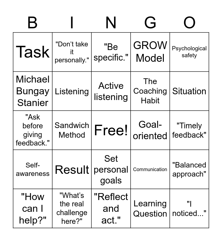 This bingo card has a free space and 36 words: Feedback, Growth, Trust, Listening, Communication, Self-awareness, Active listening, Constructive criticism, Psychological safety, Actionable feedback, Sandwich Method, GROW Model, STAR Method, Goal-oriented, Situation, Task, Action, Result, "I noticed...", "Be specific.", "Timely feedback", "Balanced approach", "What’s the real challenge here?", "How can I help?", "Reflect and act.", "Don’t take it personally.", "Ask before giving feedback.", "Assume positive intent.", The Coaching Habit, Michael Bungay Stanier, Kickstart Question, Strategic Question, Learning Question, Set personal goals, Seek feedback and Iterate and adapt.