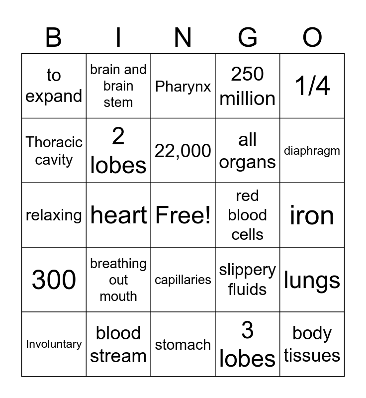 This bingo card has a free space and 24 words: Involuntary, breathing out mouth, 22,000, 3 lobes, 1/4, to expand, brain and brain stem, Pharynx, red blood cells, iron, relaxing, 2 lobes, slippery fluids, lungs, Thoracic cavity, blood stream, stomach, 250 million, diaphragm, 300, heart, capillaries, all organs and body tissues.