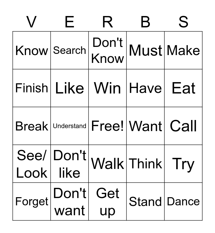 This bingo card has a free space and 29 words: Forget, Remember, Understand, Don't Understand, Know, Don't Know, Like, Don't like, Want, Don't want, Call, Dance, Get up, Stand, Eat, Run, Walk, See/ Look, Make, Break, Think, Invite, Have, Finish, Must, Search, Try, Win and Help.