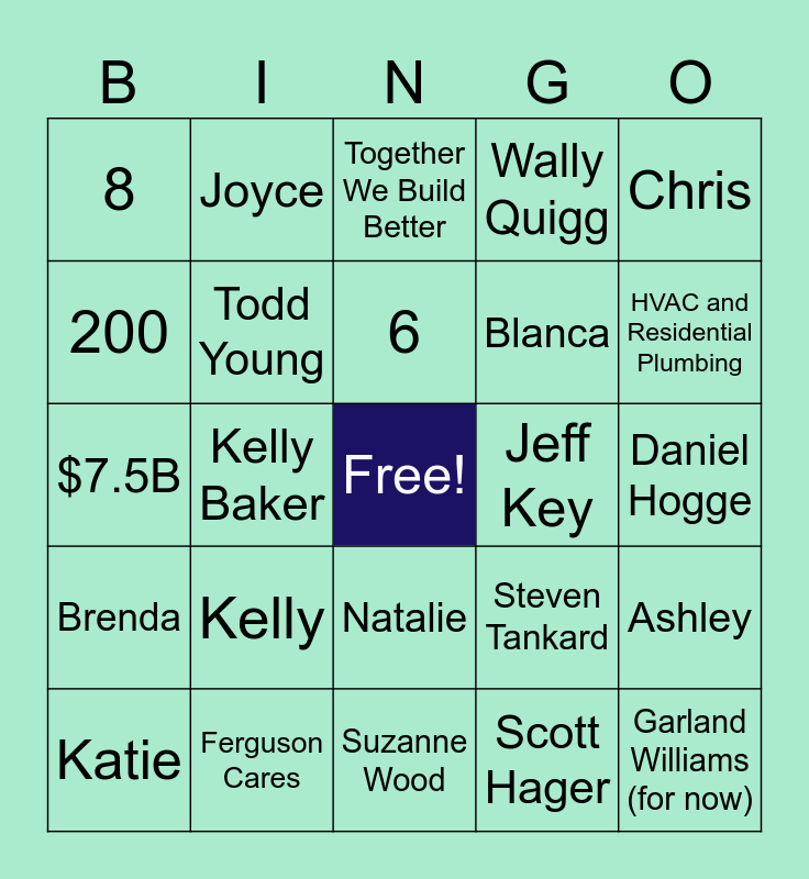 This bingo card has a free space and 31 words: Suzanne Wood, Alan Murray, Kelly Baker, Newport, News, 8, Together We Build Better, Todd Young, Steven Tankard, Jeff Key, Scott Hager, Daniel Hogge, Garland Williams (for now), Jim Golini, Bo Camposano, HVAC and Residential Plumbing, Non-Residential, Ashley, Kelly, Brenda, Natalie, Chris, Matt Mont., Katie, Joyce, Blanca, 200, Wally Quigg, $7.5B, Ferguson Cares, 6 and 2500.