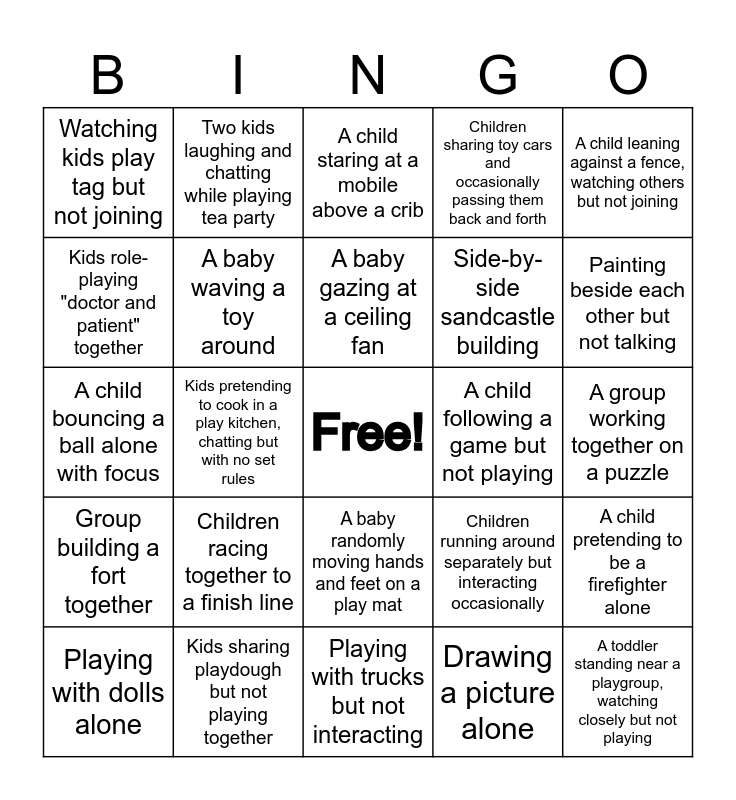 This bingo card has a free space and 24 words: Children racing together to a finish line, Kids sharing playdough but not playing together, A baby gazing at a ceiling fan, Playing with dolls alone, A child leaning against a fence, watching others but not joining, Watching kids play tag but not joining, Kids role-playing "doctor and patient" together, Two kids laughing and chatting while playing tea party, A child following a game but not playing, A baby randomly moving hands and feet on a play mat, Side-by-side sandcastle building, A child bouncing a ball alone with focus, Children running around separately but interacting occasionally, A child pretending to be a firefighter alone, A baby waving a toy around, Drawing a picture alone, A group working together on a puzzle, A child staring at a mobile above a crib, Painting beside each other but not talking, Kids pretending to cook in a play kitchen, chatting but with no set rules, A toddler standing near a playgroup, watching closely but not playing, Group building a fort together, Children sharing toy cars and occasionally passing them back and forth and Playing with trucks but not interacting.
