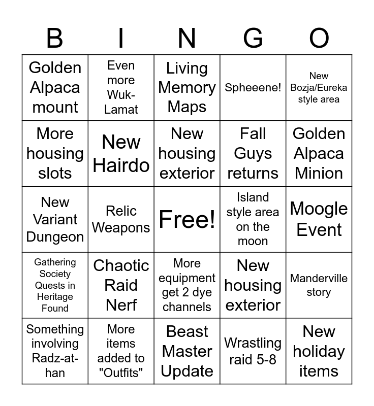 This bingo card has a free space and 24 words: Chaotic Raid Nerf, More items added to "Outfits", New housing exterior, Something involving Radz-at-han, New Bozja/Eureka style area, Golden Alpaca mount, More housing slots, Even more Wuk-Lamat, Island style area on the moon, More equipment get 2 dye channels, Fall Guys returns, New Variant Dungeon, New housing exterior, Manderville story, New Hairdo, Wrastling raid 5-8, Moogle Event, Living Memory Maps, Golden Alpaca Minion, Relic Weapons, New holiday items, Gathering Society Quests in Heritage Found, Spheeene! and Beast Master Update.