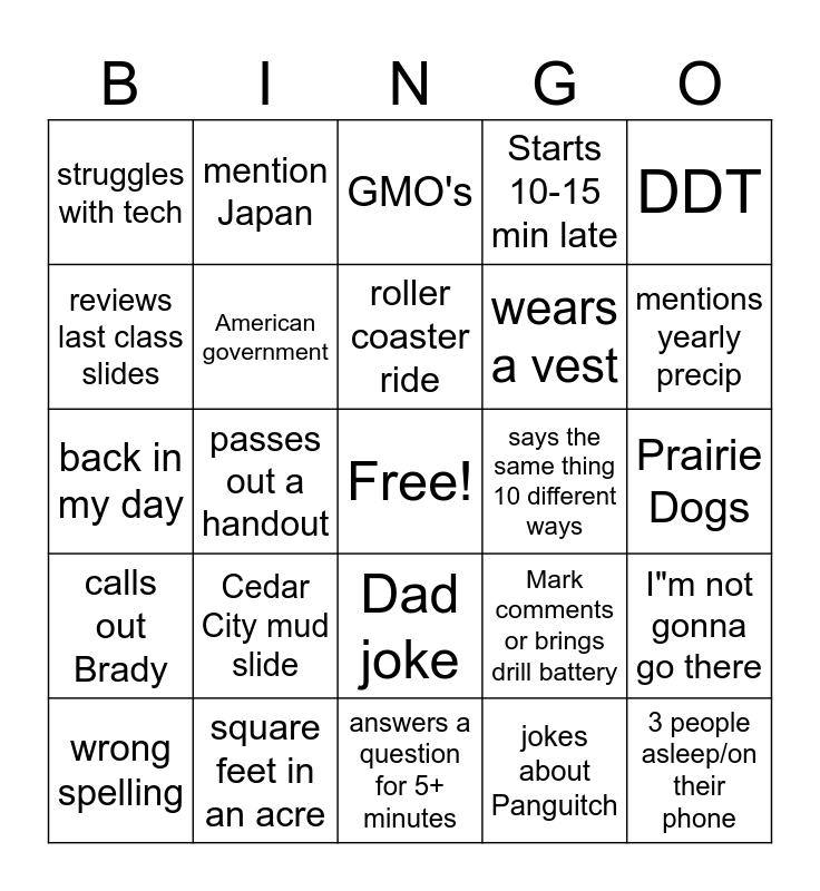 This bingo card has a free space and 24 words: Cedar City mud slide, square feet in an acre, roller coaster ride, wrong spelling, DDT, struggles with tech, reviews last class slides, mention Japan, says the same thing 10 different ways, Dad joke, wears a vest, back in my day, Mark comments or brings drill battery, I"m not gonna go there, American government, jokes about Panguitch, Prairie Dogs, GMO's, mentions yearly precip, passes out a handout, 3 people asleep/on their phone, calls out Brady, Starts 10-15 min late and answers a question for 5+ minutes.