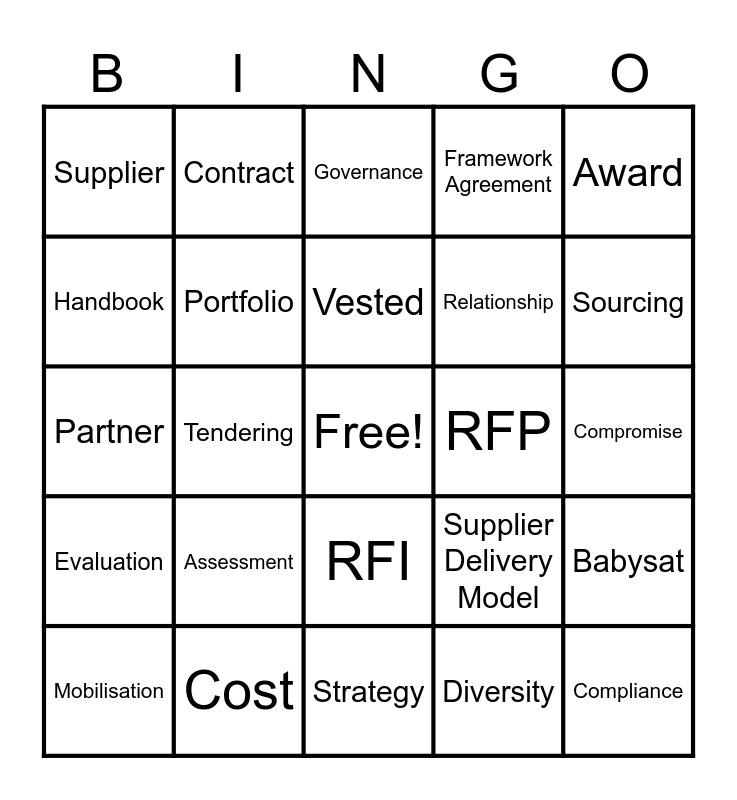 This bingo card has a free space and 25 words: Assessment, Strategy, Vested, Mobilisation, Award, Supplier, Handbook, Contract, RFP, RFI, Relationship, Partner, Supplier Delivery Model, Babysat, Portfolio, Bundling, Compromise, Governance, Sourcing, Tendering, Compliance, Cost, Evaluation, Framework Agreement and Diversity.