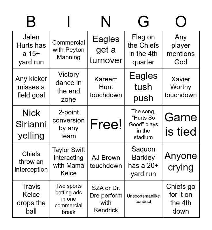 This bingo card has a free space and 24 words: Taylor Swift interacting with Mama Kelce, Two sports betting ads in one commercial break, Kareem Hunt touchdown, Travis Kelce drops the ball, Any player mentions God, Jalen Hurts has a 15+ yard run, Any kicker misses a field goal, Commercial with Peyton Manning, The song, "Hurts So Good" plays in the stadium, AJ Brown touchdown, Eagles tush push, Nick Sirianni yelling, Saquon Barkley has a 20+ yard run, Anyone crying, Victory dance in the end zone, Unsportsmanlike conduct, Game is tied, Eagles get a turnover, Xavier Worthy touchdown, 2-point conversion by any team, Chiefs go for it on the 4th down, Chiefs throw an interception, Flag on the Chiefs in the 4th quarter and SZA or Dr. Dre perform with Kendrick.
