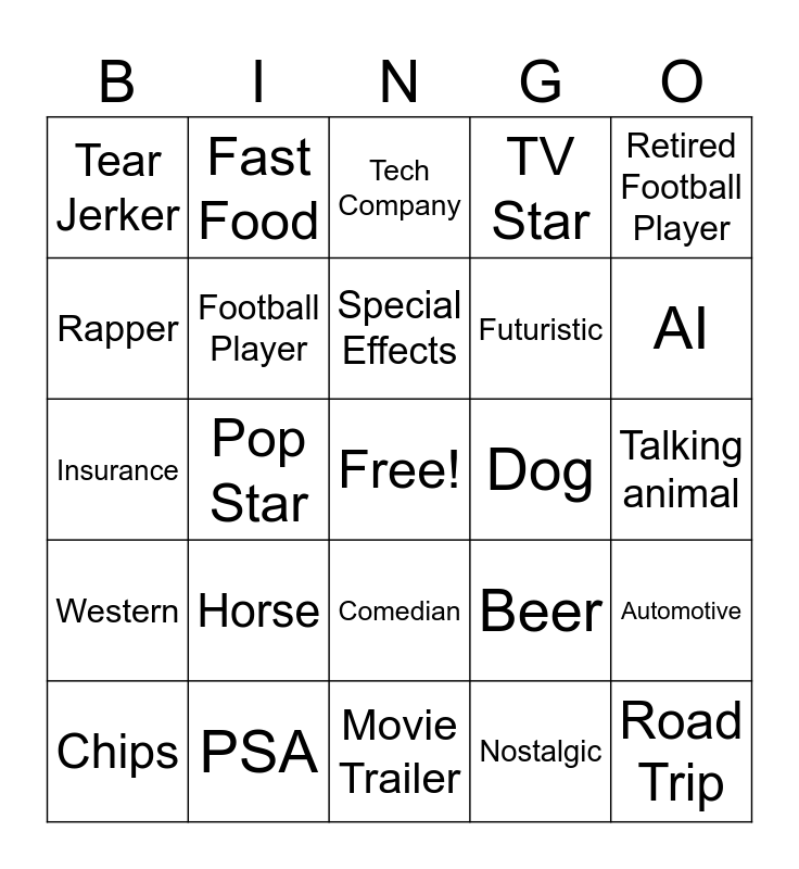 This bingo card has a free space and 24 words: Horse, PSA, Special Effects, Chips, Retired Football Player, Tear Jerker, Rapper, Fast Food, Dog, Comedian, Futuristic, Insurance, Beer, Automotive, Football Player, Nostalgic, Talking animal, Tech Company, AI, Pop Star, Road Trip, Western, TV Star and Movie Trailer.