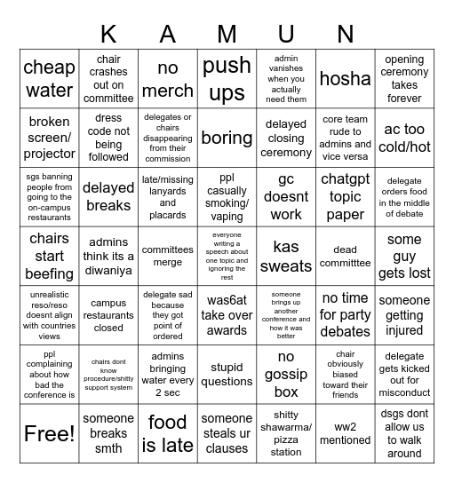 This bingo card has 49 words: chair obviously biased toward their friends, core team rude to admins and vice versa, shitty shawarma/ pizza station, admins think its a diwaniya, late/missing lanyards and placards, some guy gets lost, chair crashes out on committee, food is late, hosha, was6at take over awards, opening ceremony takes forever, push ups, chatgpt topic paper, gc doesnt work, chairs dont know procedure/shitty support system, dead committtee, broken screen/ projector, ac too cold/hot, delegate gets kicked out for misconduct, admin vanishes when you actually need them, delayed closing ceremony, committees merge, cheap water, dress code not being followed, Free!, delegates or chairs disappearing from their commission, delegate orders food in the middle of debate, someone breaks smth, ppl casually smoking/ vaping, delayed breaks, dsgs dont allow us to walk around, kas sweats, ppl complaining about how bad the conference is, admins bringing water every 2 sec, chairs start beefing, someone brings up another conference and how it was better, no time for party debates, someone getting injured, sgs banning people from going to the on-campus restaurants, delegate sad because they got point of ordered, stupid questions, unrealistic reso/reso doesnt align with countries views, everyone writing a speech about one topic and ignoring the rest, someone steals ur clauses, boring, no merch, no gossip box, campus restaurants closed and ww2 mentioned.
