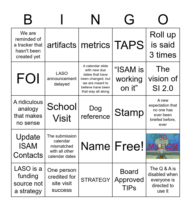 This bingo card has 1 images and 25 words: The submission calendar mismatched with all other calendar dates, STRATEGY, A calendar slide with new due dates that have been changed, but we are meant to believe have been that way all along, LASO is a funding source not a strategy, Roll up is said 3 times, We are reminded of a tracker that hasn't been created yet, FOI, artifacts, Stamp, Name, “ISAM is working on it”, A ridiculous analogy that makes no sense, Free!, 30 MILLION, LASO announcement delayed, The Q & A is disabled when everyone is directed to use it, A new expectation that no one has ever been briefed before, ever, metrics, The vision of SI 2.0, School Visit, Dog reference, One person credited for site visit success, Update ISAM Contacts, TAPS and Board Approved TIPs.