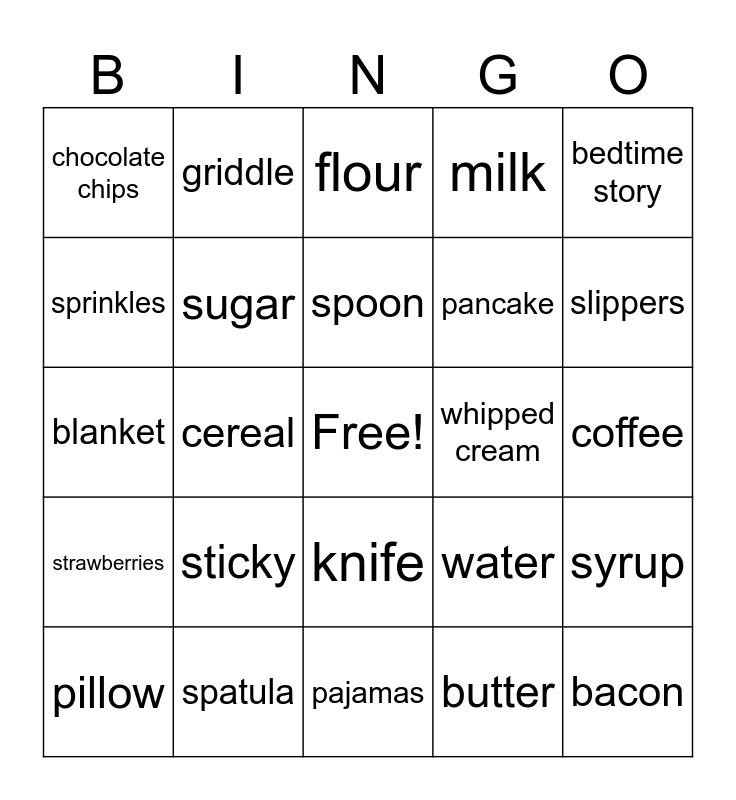This bingo card has a free space and 28 words: syrup, blueberries, pancake, butter, sprinkles, flour, griddle, strawberries, whipped cream, pillow, blanket, milk, spatula, pajamas, slippers, fork, sticky, sugar, spoon, knife, chocolate chips, eggs, bacon, cereal, coffee, water, bedtime story and nightlight.