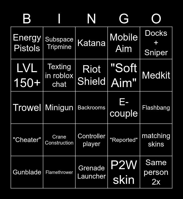 This bingo card has 25 words: "Cheater", Flamethrower, Backrooms, P2W skin, Docks + Sniper, Energy Pistols, Subspace Tripmine, Katana, E-couple, matching skins, LVL 150+, Texting in roblox chat, Grenade Launcher, "Reported", Medkit, Gunblade, Minigun, Riot Shield, "Soft Aim", Flashbang, Trowel, Crane Construction, Controller player, Mobile Aim and Same person 2x.
