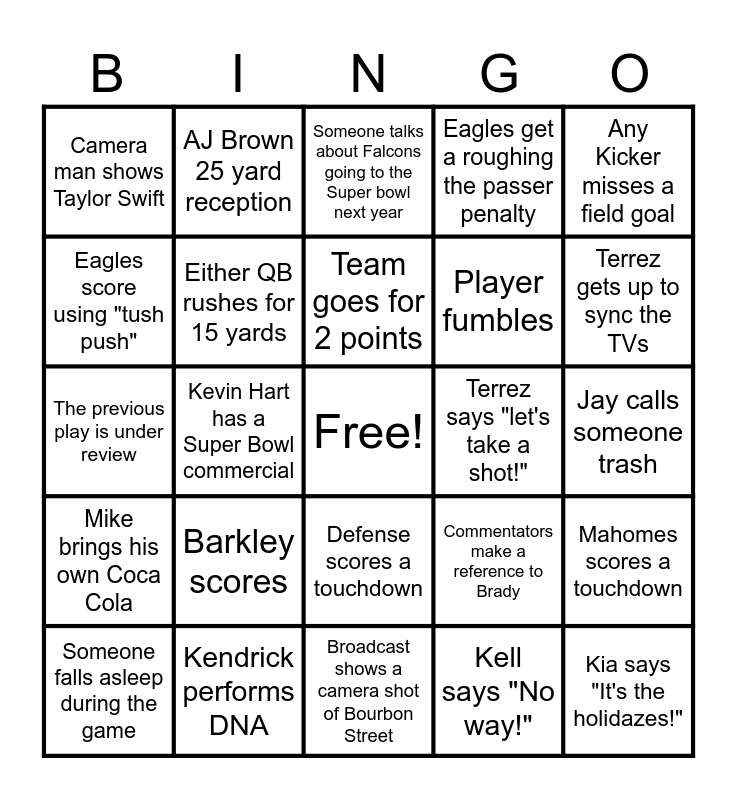 This bingo card has a free space and 24 words: Someone falls asleep during the game, Barkley scores, Team goes for 2 points, Kell says "No way!", Any Kicker misses a field goal, Camera man shows Taylor Swift, AJ Brown 25 yard reception, Someone talks about Falcons going to the Super bowl next year, Terrez says "let's take a shot!", Jay calls someone trash, The previous play is under review, Either QB rushes for 15 yards, Commentators make a reference to Brady, Mahomes scores a touchdown, Eagles score using "tush push", Kendrick performs DNA, Broadcast shows a camera shot of Bourbon Street, Eagles get a roughing the passer penalty, Terrez gets up to sync the TVs, Mike brings his own Coca Cola, Kevin Hart has a Super Bowl commercial, Defense scores a touchdown, Player fumbles and Kia says "It's the holidazes!".