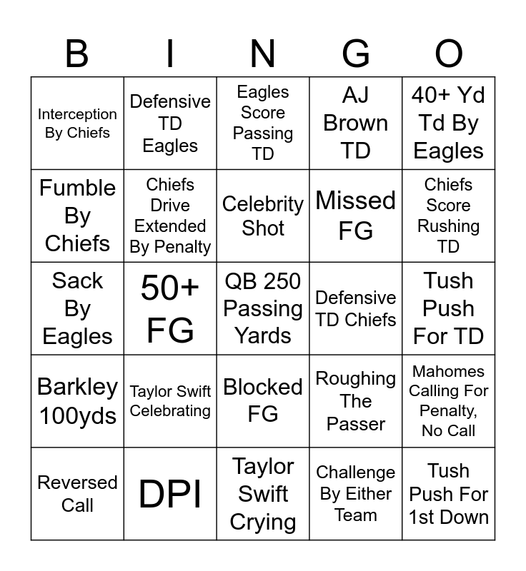 This bingo card has 25 words: Taylor Swift Celebrating, Taylor Swift Crying, Celebrity Shot, Reversed Call, 40+ Yd Td By Eagles, Interception By Chiefs, Fumble By Chiefs, Defensive TD Eagles, Defensive TD Chiefs, Blocked FG, Missed FG, Sack By Eagles, Roughing The Passer, Mahomes Calling For Penalty, No Call, Chiefs Drive Extended By Penalty, Tush Push For 1st Down, Tush Push For TD, Eagles Score Passing TD, Chiefs Score Rushing TD, 50+ FG, QB 250 Passing Yards, DPI, Barkley 100yds, AJ Brown TD and Challenge By Either Team.