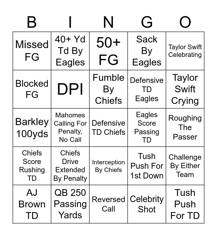 This bingo card has 25 words: Chiefs Drive Extended By Penalty, Reversed Call, Fumble By Chiefs, AJ Brown TD, Taylor Swift Celebrating, Missed FG, Blocked FG, 40+ Yd Td By Eagles, Eagles Score Passing TD, Interception By Chiefs, Defensive TD Eagles, Barkley 100yds, Tush Push For 1st Down, Challenge By Either Team, DPI, Tush Push For TD, Roughing The Passer, 50+ FG, Taylor Swift Crying, Mahomes Calling For Penalty, No Call, Defensive TD Chiefs, QB 250 Passing Yards, Chiefs Score Rushing TD, Sack By Eagles and Celebrity Shot.