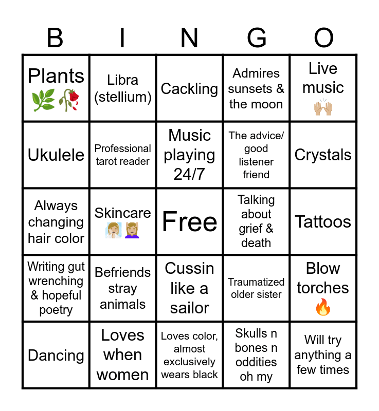 This bingo card has a free space and 24 words: Dancing, Befriends stray animals, Music playing 24/7, Skulls n bones n oddities oh my, Live music ππΌ, Plants πΏπ₯, Libra (stellium), Cackling, Talking about grief & death, Tattoos, Always changing hair color, Professional tarot reader, Traumatized older sister, Blow torches π₯, Ukulele, Loves when women, Loves color, almost exclusively wears black, Admires sunsets & the moon, Crystals, Writing gut wrenching & hopeful poetry, Skincareπ§πΌββοΈππΌββοΈ, Cussin like a sailor, The advice/ good listener friend and Will try anything a few times.