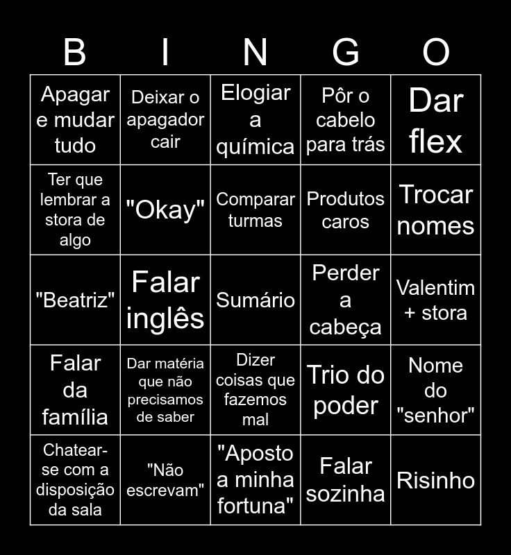 This bingo card has a free space and 41 words: Usar a mão, "Beatriz", Chamar o Edahar de João, "Okay", "Não escrevam", Dizer coisas que fazemos mal, Comparar turmas, Sacar o telemóvel, Dar flex, Falar da família, Falar inglês, Pôr o cabelo para trás, Risinho, Valentim + stora, Perder a cabeça, Dar matéria que não precisamos de saber, Perder-se, Apagar e mudar tudo, Nomenclatura IUPAC, Elogiar a química, Nome do "senhor", Fazer algo errado, "Aposto a minha fortuna", Produtos caros, Não dar tempo para ex's, Chamar nos burros indiretamente, Falar sozinha, Corrigir o manual, Trocar nomes, "Bom", "Muito bem", Deixar o apagador cair, Chatear-se com a disposição da sala, Deixar algo cair, Trio do poder, Ter que lembrar a stora de algo, Mudar os adjetivos, Mau humor, "tou-me a fazer entender?", dizer que não gosta de algo e usar(questões resolvidas) and "desculpem a redundância".