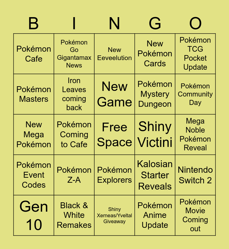 This bingo card has a free space and 24 words: Pokémon Z-A, Black & White Remakes, New Game, Gen 10, Pokémon TCG Pocket Update, Pokémon Cafe, Pokémon Masters, Pokémon Go Gigantamax News, Shiny Victini, Pokémon Explorers, Pokémon Mystery Dungeon, New Mega Pokémon, Kalosian Starter Reveals, Nintendo Switch 2, Iron Leaves coming back, Pokémon Anime Update, Mega Noble Pokémon Reveal, New Eeveelution, Pokémon Community Day, Pokémon Coming to Cafe, Pokémon Movie Coming out, Pokémon Event Codes, New Pokémon Cards and Shiny Xerneas/Yveltal Giveaway.